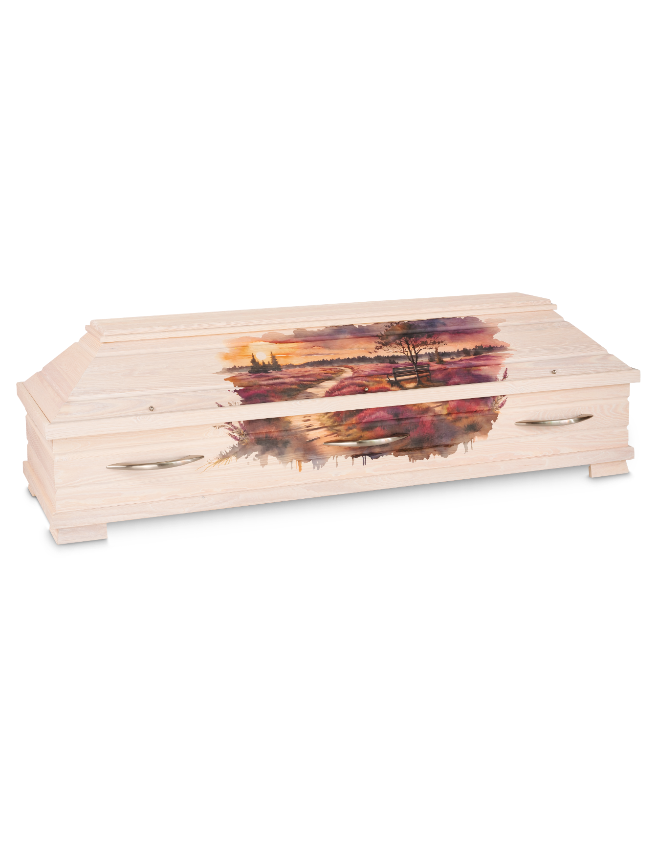 Dieser liebevoll gestaltete Sarg mit Lavendel-Motiv Lüneburger Heide gehört zur Sargserie „Spektrum-Motivsärge“. Diese Sargserie ist in Zusammenarbeit mit unserem Partner „DREYER Bestattungsbedarf GmbH“ entstanden.